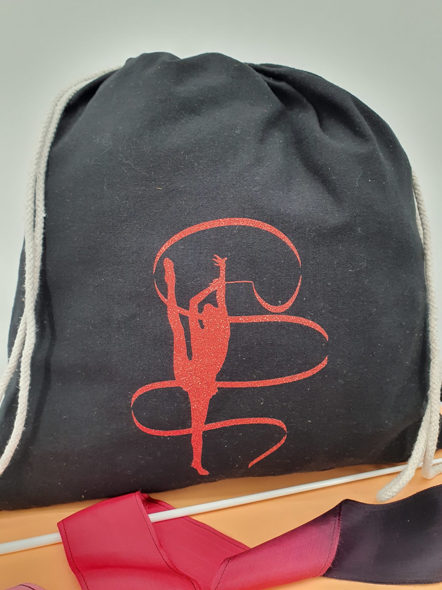 Sac à dos en coton avec un flocage rouge pailleté d’une gymnaste en mouvement avec un ruban. Le sac se referme en tirant sur les bretelles.