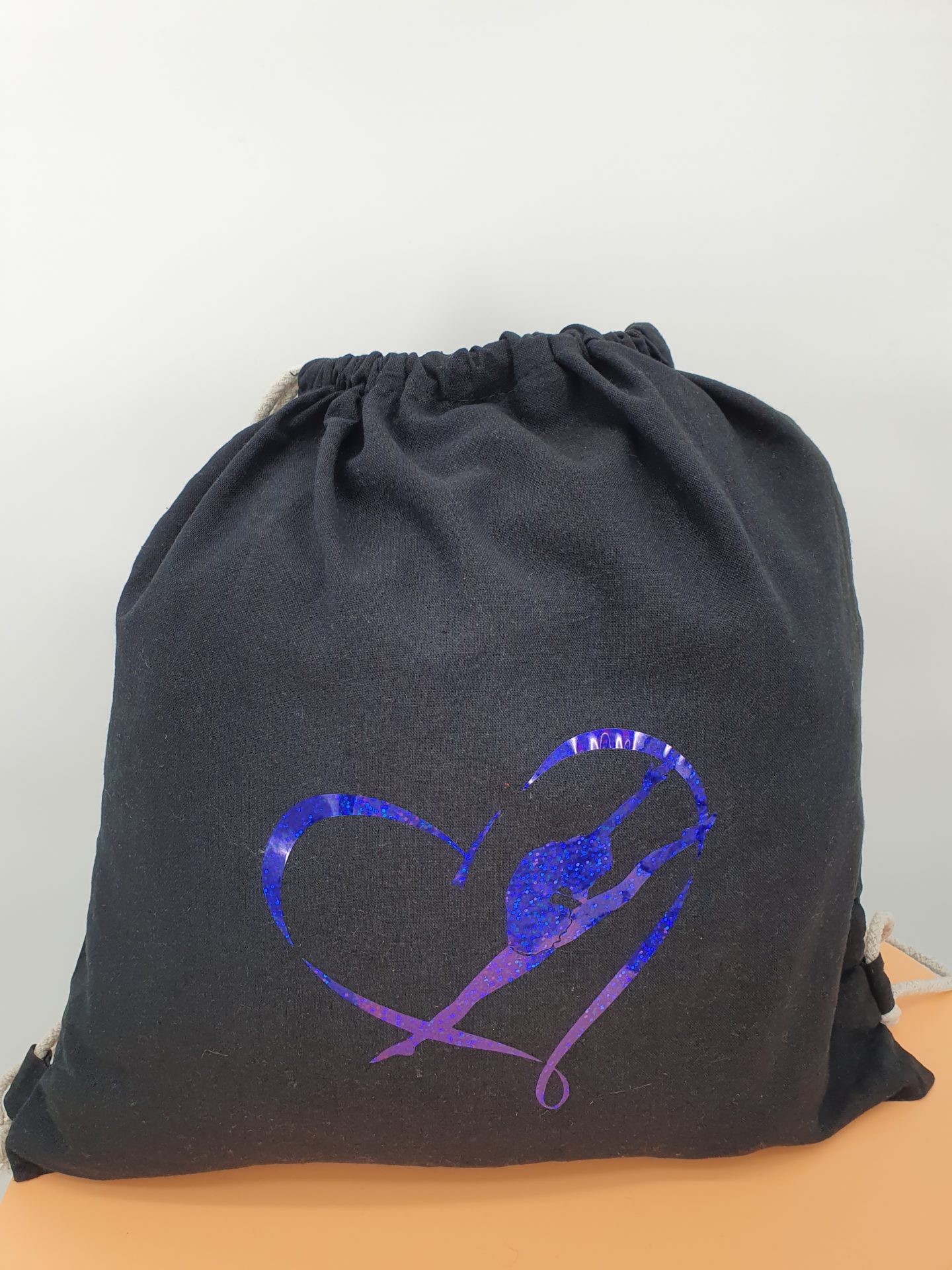 Sac à dos noir en coton avec un flocage d’une gymnaste en mouvement avec un ruban bleu. Le sac se referme en tirant sur les bretelles.