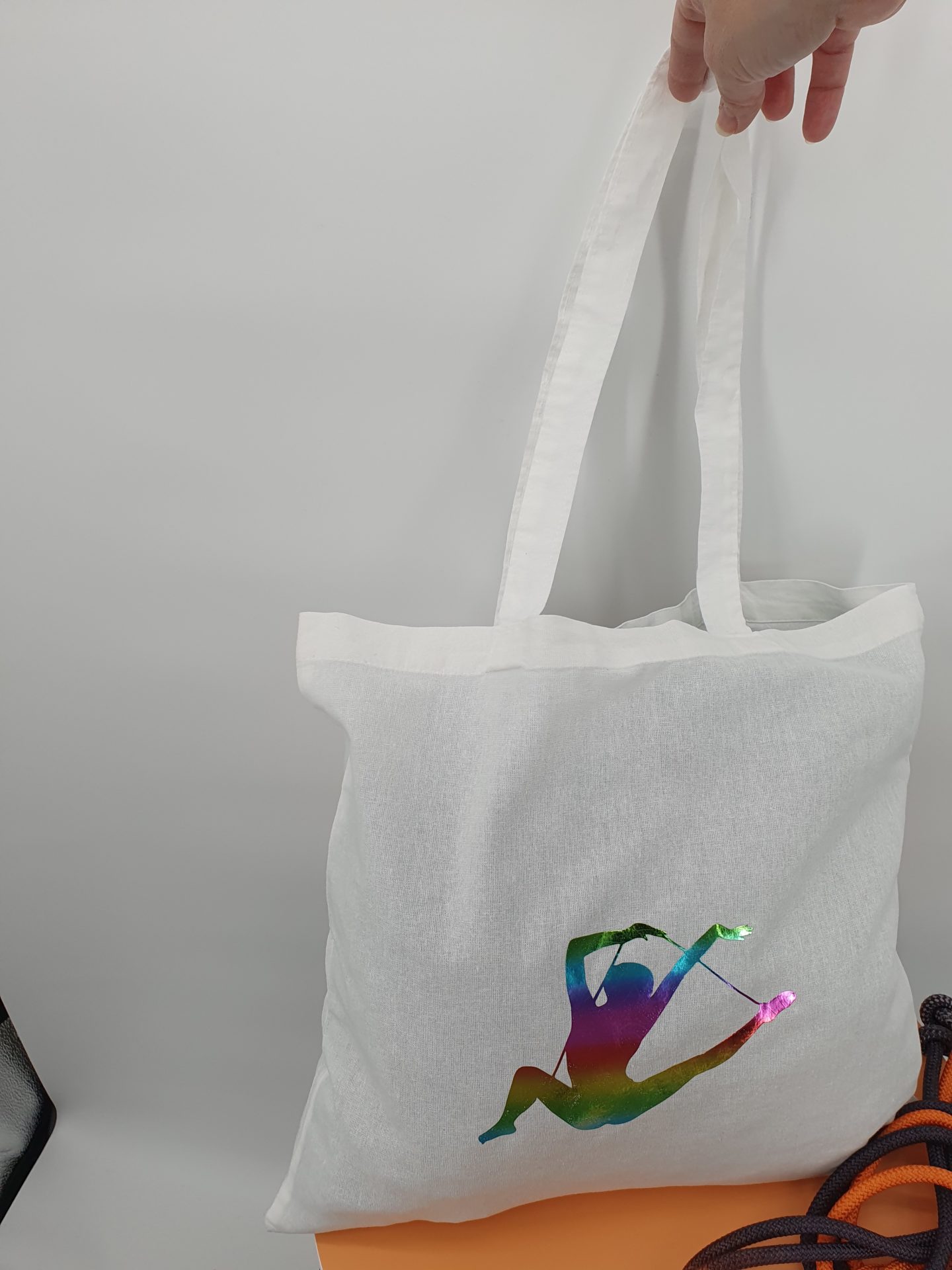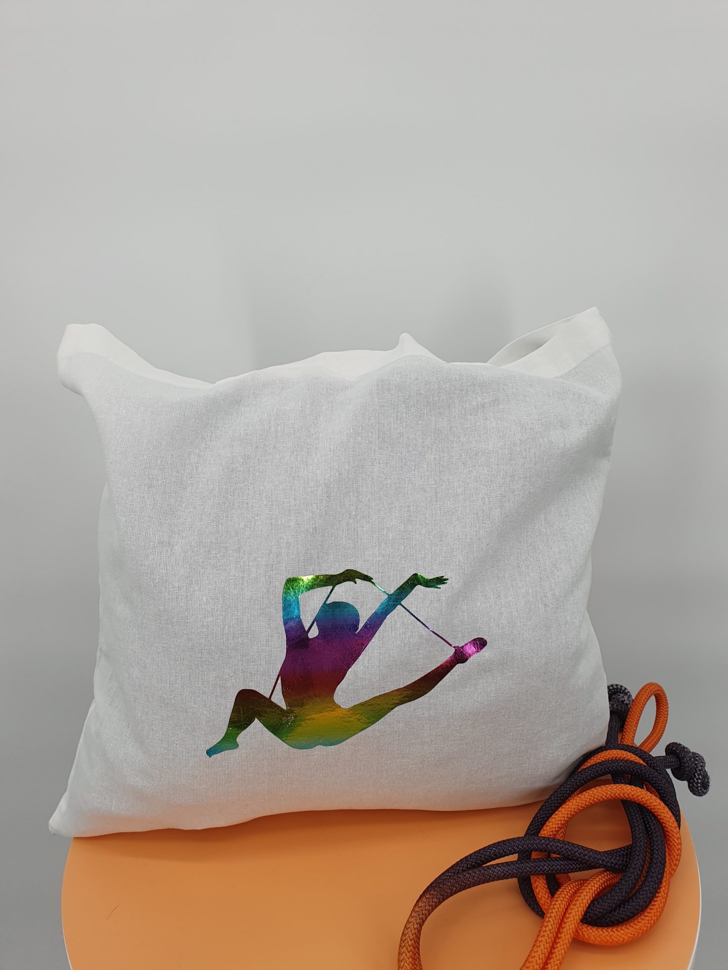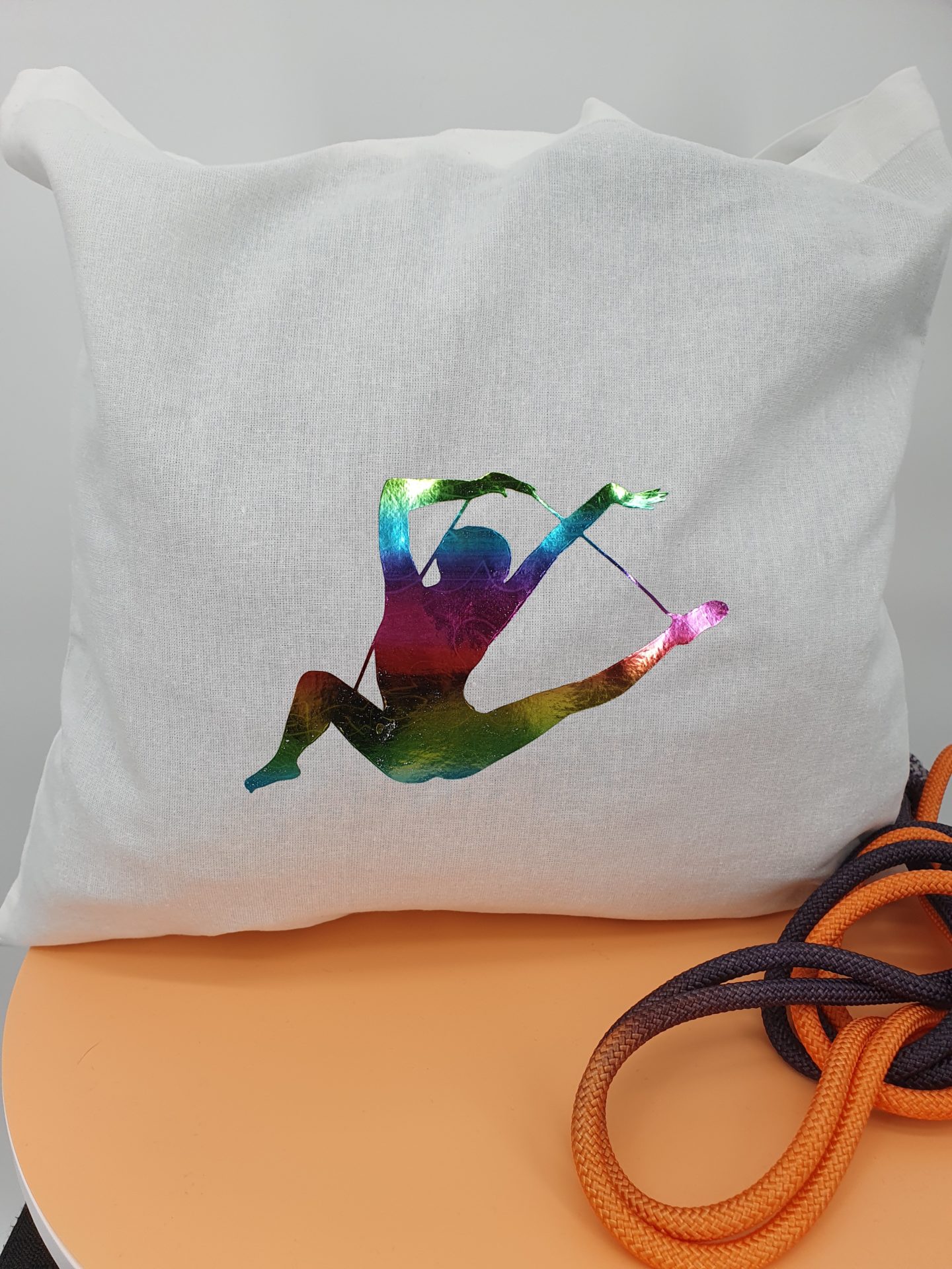 Tote-bag noir en coton avec un flocage d’une gymnaste à la corde multicolors.